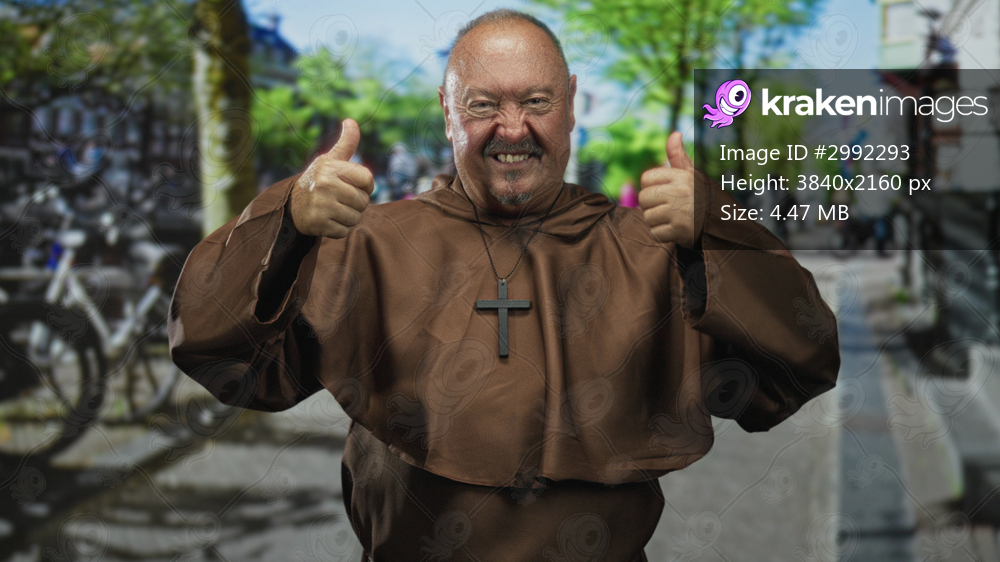 Man monk in brown robe with large cross necklace points both fingers down while facing camera on a street; devotion.