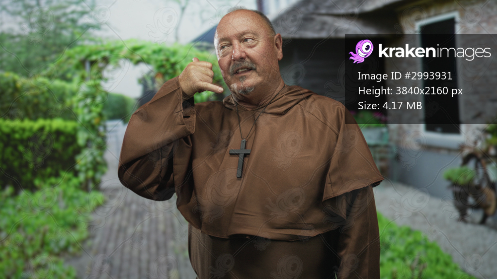 Man monk in brown robe makes call hand gesture to ear while wearing wooden cross necklace outside building courtyard and path; playful devotion.
