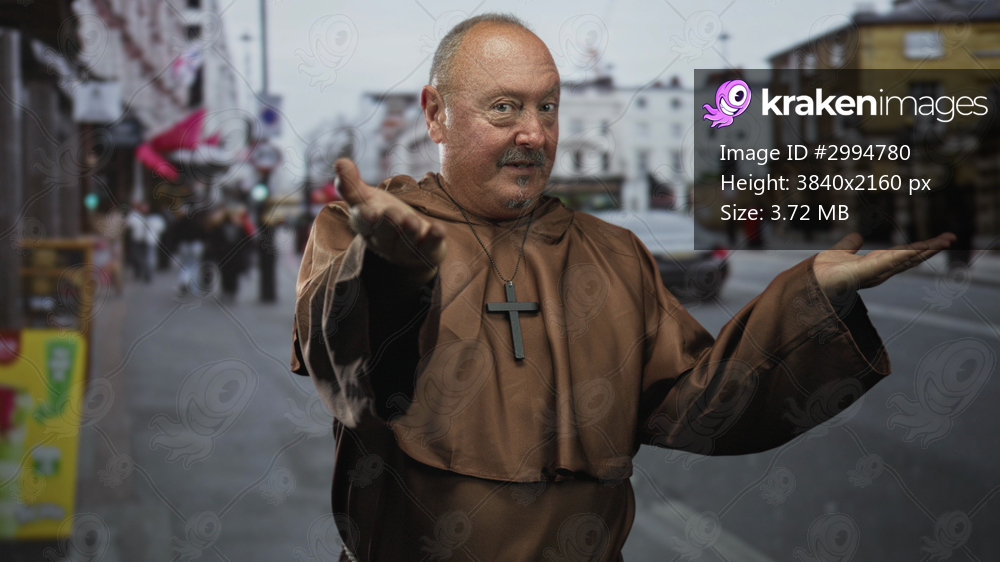 Man monk in brown robe with outstretched hands and cross necklace on street in town center; faith serenity.