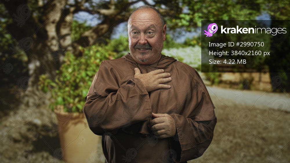 Man monk, senior, wearing brown habit and wooden cross, holds hands to chest and gestures open palms in a courtyard building; faith serenity.