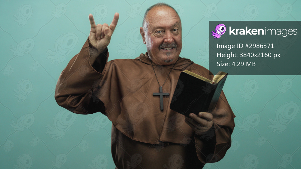 Man monk wearing brown habit and cross necklace holding bible and raising hand in rock horns gesture in studio; playful devotion.