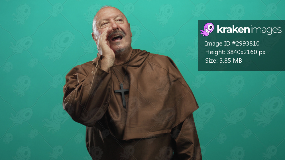 Man monk wearing brown habit and wooden cross cupping hand to mouth shouting in studio; devotion praise.