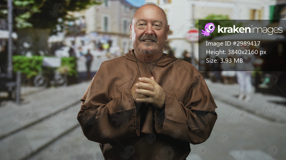 Man monk wearing brown robe and cross necklace with clasped hands and closed eyes on a busy street lined with cafes and umbrellas; serenity.