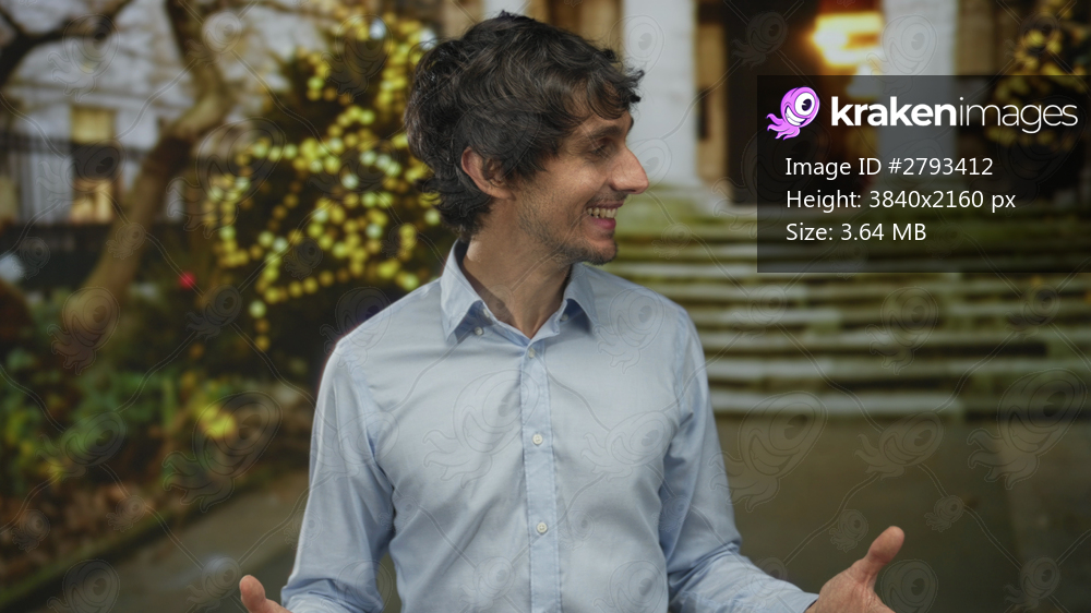 Man with mouth open and arms out on street beside illuminated trees and stone steps at dusk; excitement.