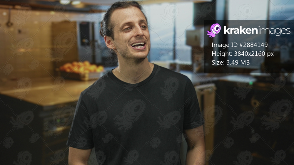 Man with mouth visible smiling in a kitchen near metal countertop and fruit bowl, long hair tied back, wearing black t shirt and earrings; casual optimism. - Kraken Images