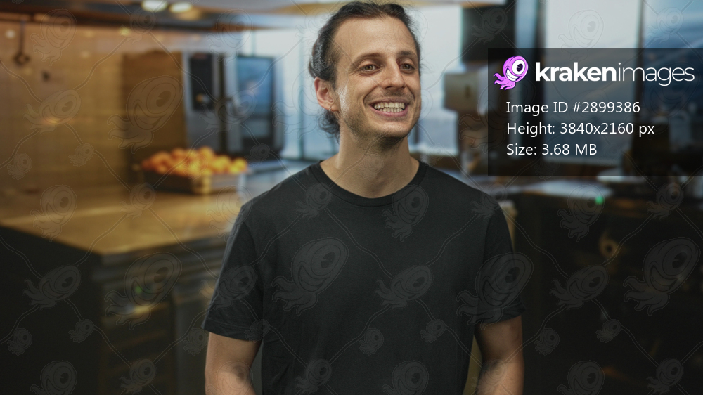 Man with mouth visible smiling in a kitchen near metal countertop and fruit bowl, long hair tied back, wearing black t shirt and earrings; casual optimism. - Kraken Images