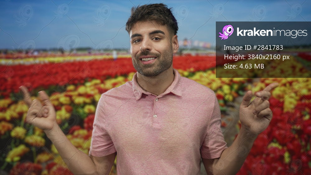 Man with nose ring and pink shirt pointing finger to red and yellow tulip flowers in forest under blue sky; wonder.