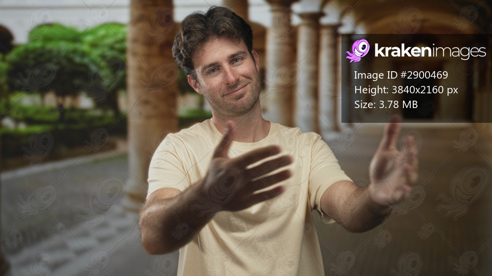 Man offering open arms and hands crossed over chest, smiling in building arcade in old town; warm gratitude.