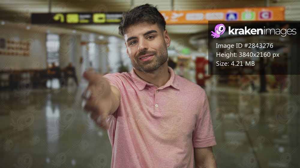 Man offers handshake with outstretched right hand wearing pink polo shirt in modern airport terminal near departure signs; welcome greeting reception.