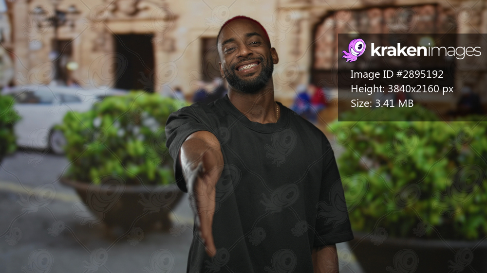 Man offers outstretched hand for handshake on a city street in front of building, smiling and leaning forward; friendly greeting.