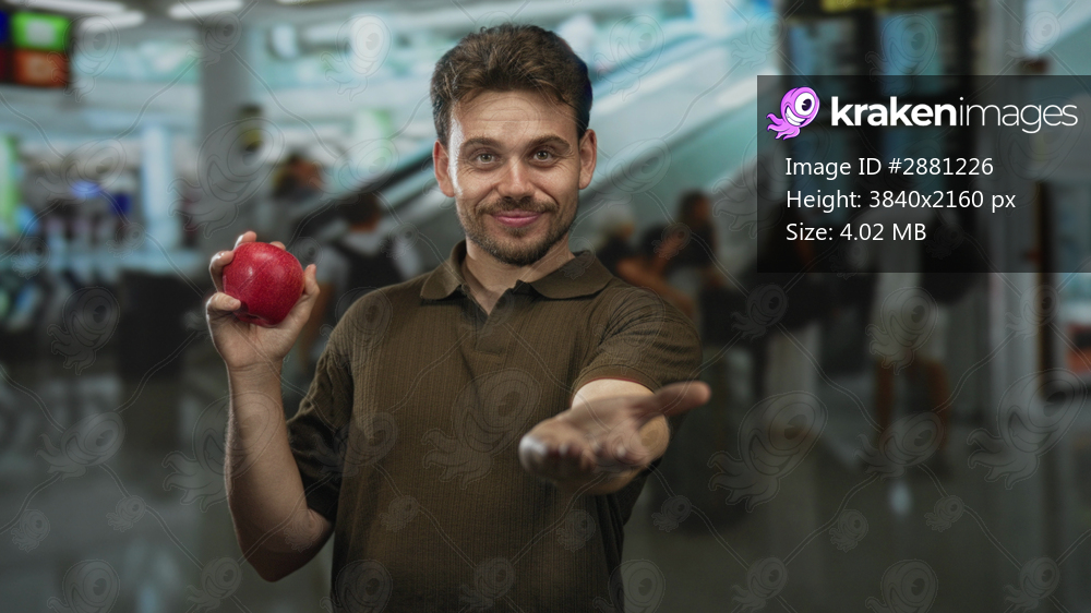 Man offers red apple with outstretched hand inside train station building, smiling with closed eyes and visible forearm; generosity welcome.