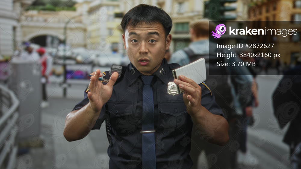Man officer holding notebook with raised hand and shocked expression in crowded street; surprise urgency.