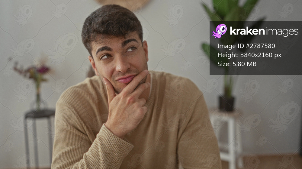 Man often rests chin on hand gently touching his face at home as a hispanic male young subject appears pensive in a portrait wearing a sweater.