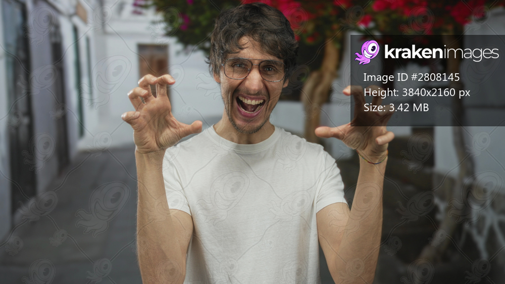 Man on city street wearing glasses and a white tshirt with hands curled into claws and a playful grin; playfulness.