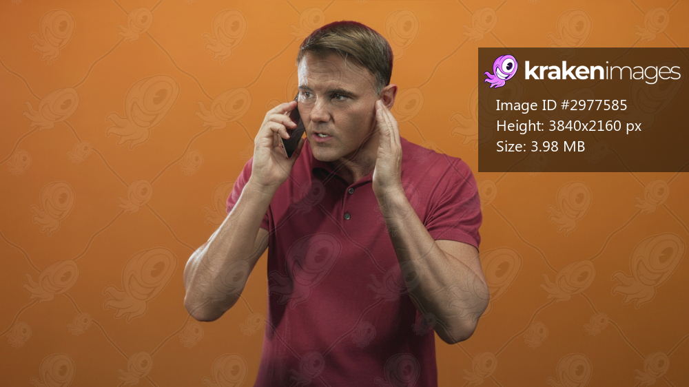 Man on phone holding smartphone to ear and covering his other ear in studio with orange backdrop and polo shirt; frustration stress interruption.