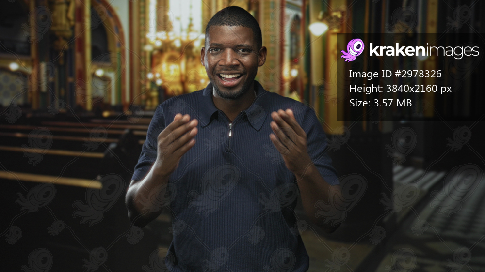 Man with open hands and closed eyes singing and smiling while gesturing in an ornate church building with pews, chandelier and altar visible; joy faith hope. - Kraken Images