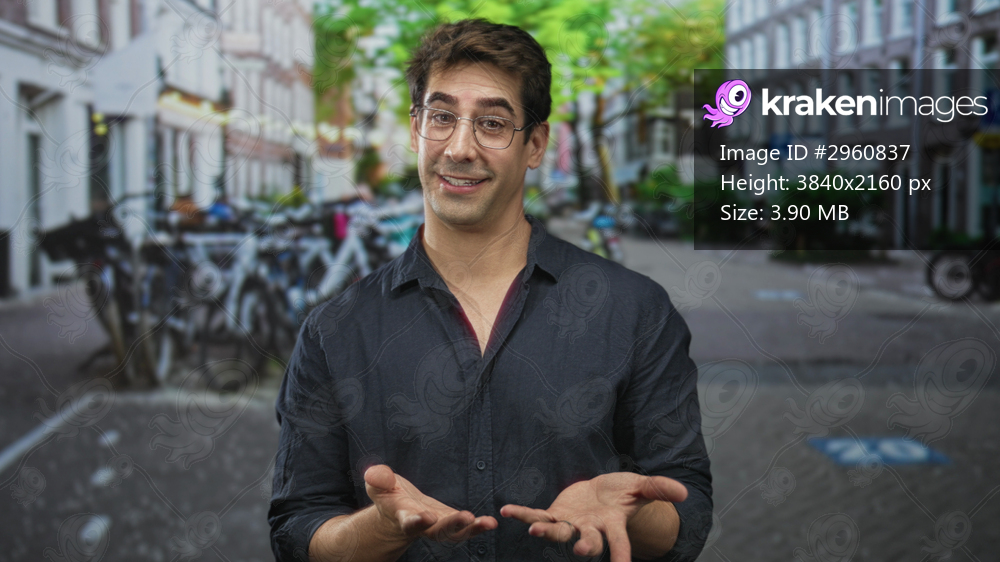 Man with open hands gestures toward parked bicycles on a city street while smiling and wearing glasses, casual shirt and relaxed pose; friendly invitation. - Kraken Images