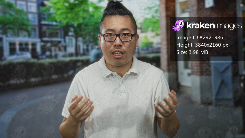 Man with open hands gesturing while speaking on a city street near a brick building and hedge, wearing glasses and white polo; engaged discussion.