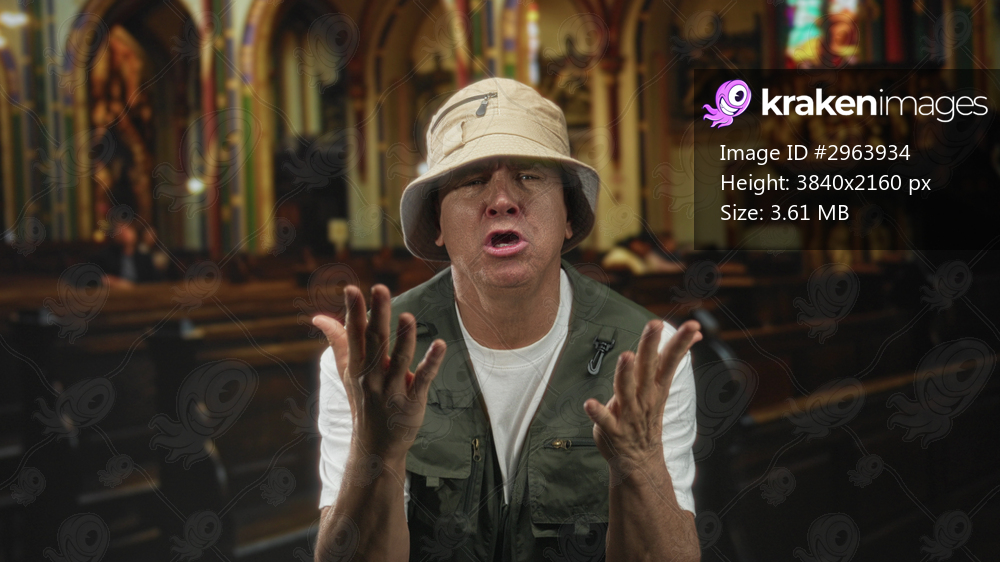 Man with open hands pleading gesture in church building wearing bucket hat and fishing vest, mouth open as if speaking; penitence solitude.