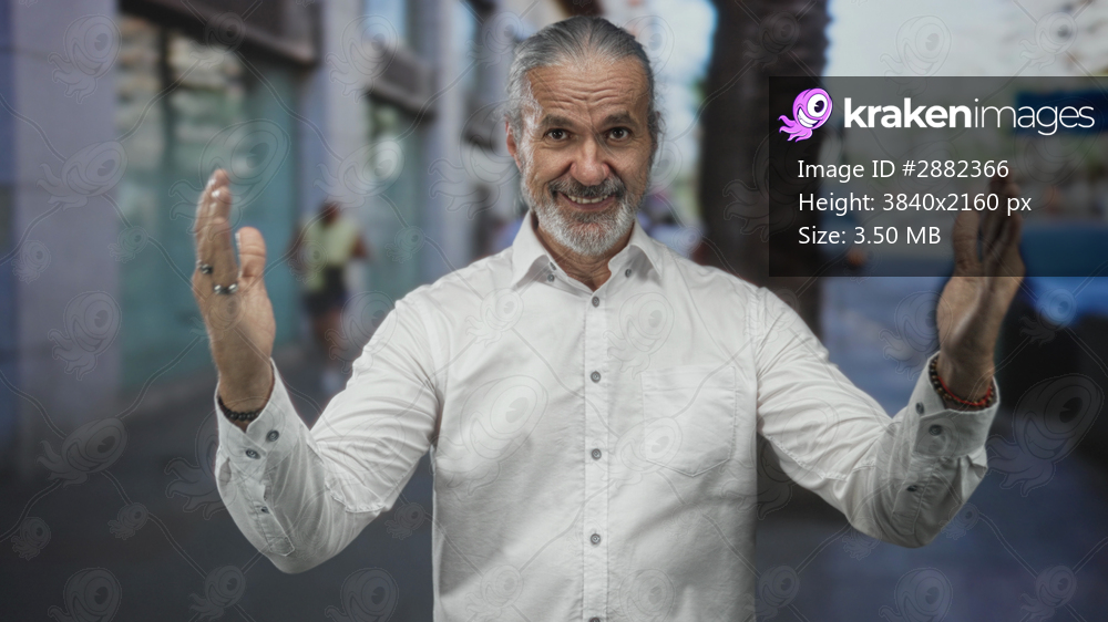 Man with open hands and raised arms on a busy urban street, wearing white shirt and smiling at camera; friendliness openness.