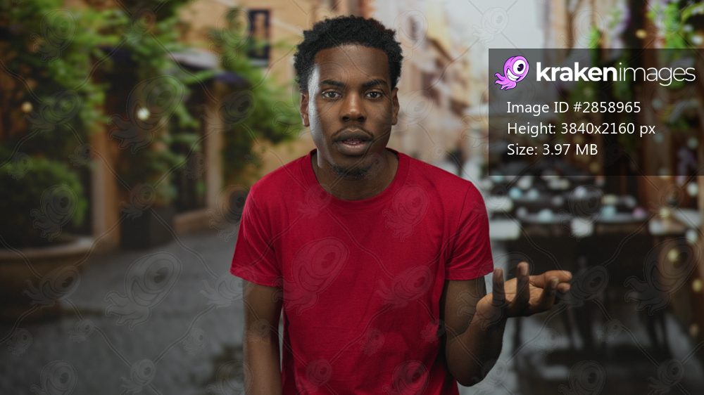 Man with open palm gesture in red shirt at outdoor restaurant terrace on cobblestone street; doubt.