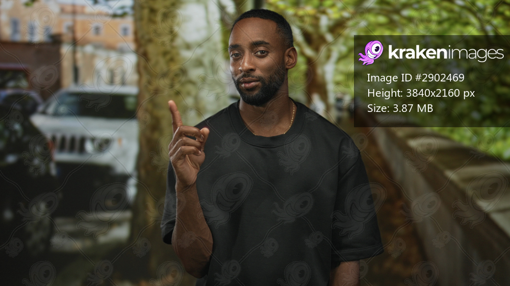 Man with open palm presenting on a tree lined street beside parked cars and a stone balustrade; contemplation.
