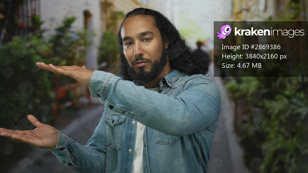 Man with open palms gesture on a narrow plant lined street wearing denim jacket, presenting space between hands; serenity reflection.