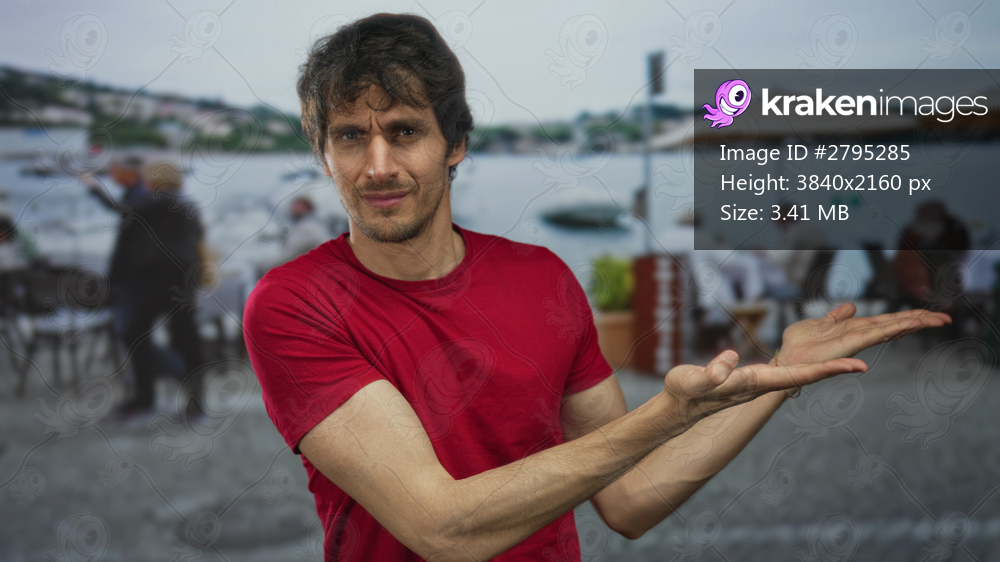 Man with open palms gesture wearing red tshirt on waterfront cafe terrace overlooking boats and bay; invitation confusion.