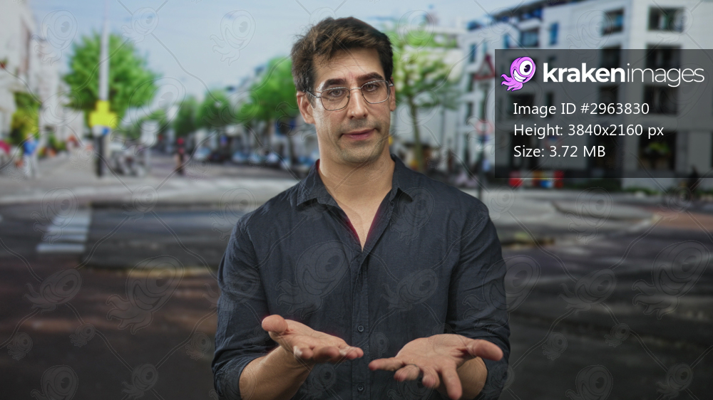 Man with open palms gesturing at a city crosswalk on a street, wearing glasses and dark shirt, mid explanation to camera; questioning.