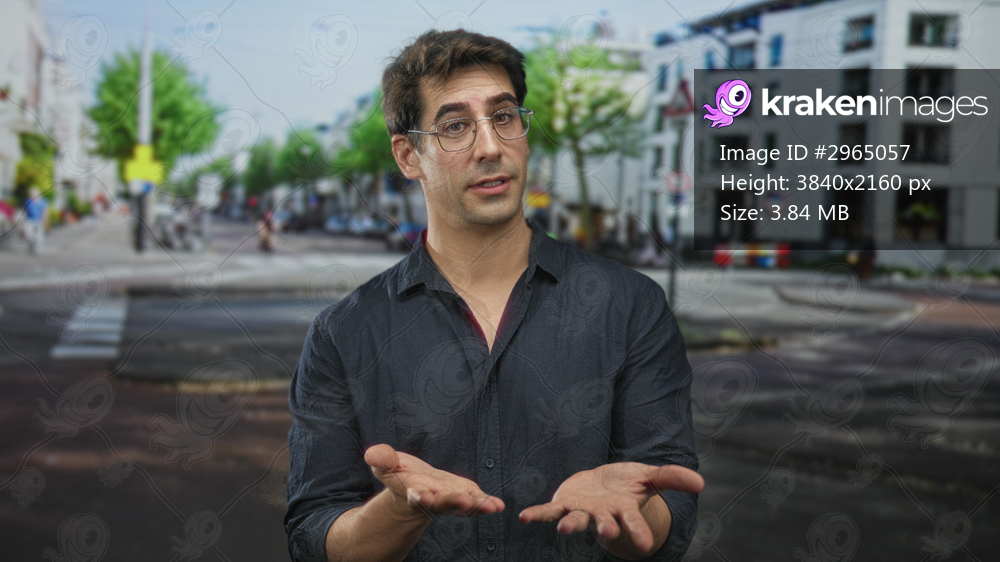 Man with open palms gesturing at a city crosswalk on a street, wearing glasses and dark shirt, mid explanation to camera; questioning.