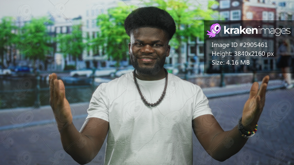 Man with open palms gesturing on a city street by a canal, smiling at camera in a white t shirt and beaded necklace; friendly welcome.