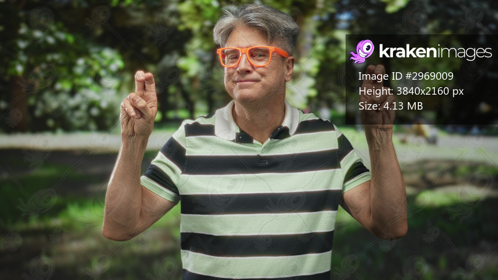Man with orange glasses raises both hands showing two raised fingers in park, striped polo visible; playful optimism.