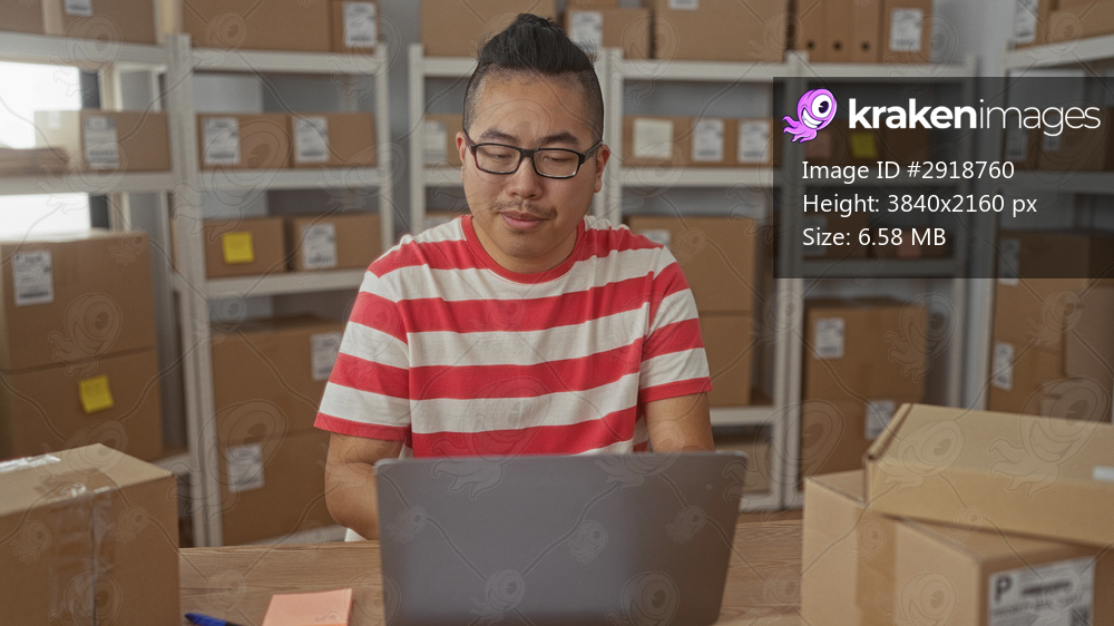 Man organizing parcels and working on laptop at packing table in building office; small business ecommerce focused.