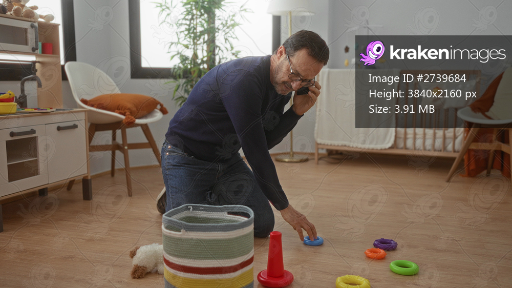 Man organizing toys in cozy bedroom while talking on phone, surrounded by colorful baby items in modern home environment.