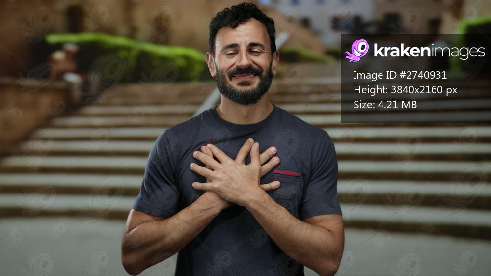 Man outdoors with beard smiling and embracing himself on a city street, conveying peace and happiness.