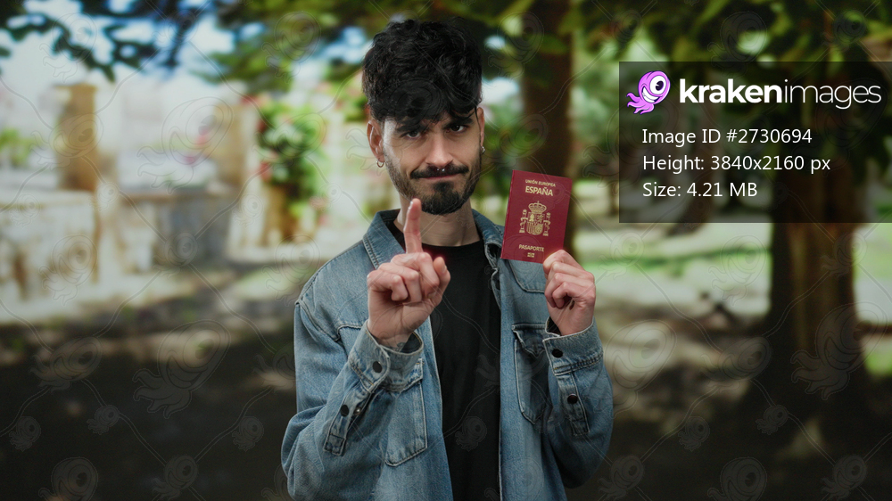 Man outdoors holding spanish passport in park, highlighting travel and identification themes while standing confidently in casual attire.