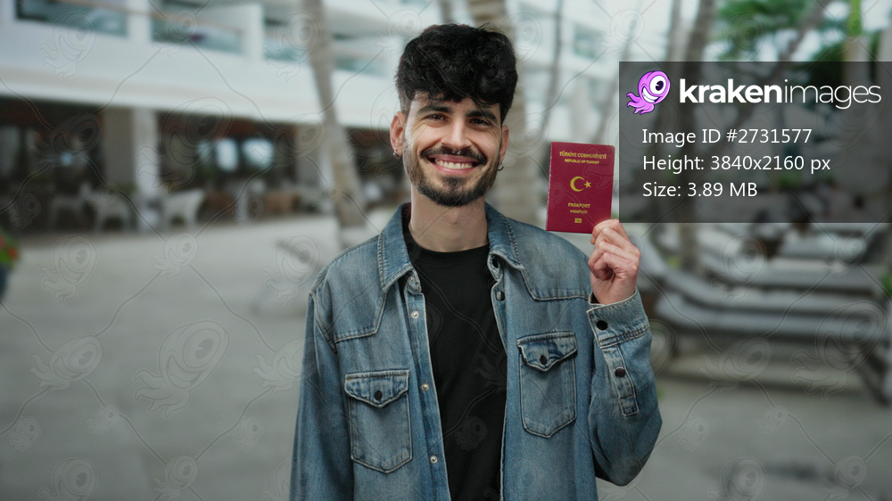 Man outdoors holding turkish passport in urban setting showcasing travel and identity concept in contemporary town street.