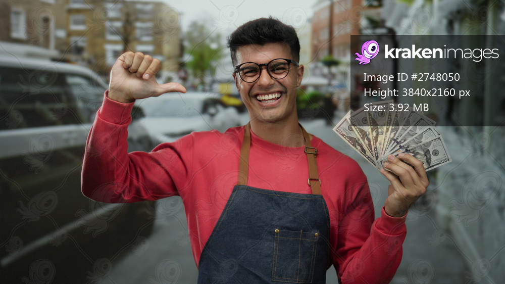 Man outdoors in city holding american banknotes, wearing glasses and apron, smiling and gesturing confidently on street.