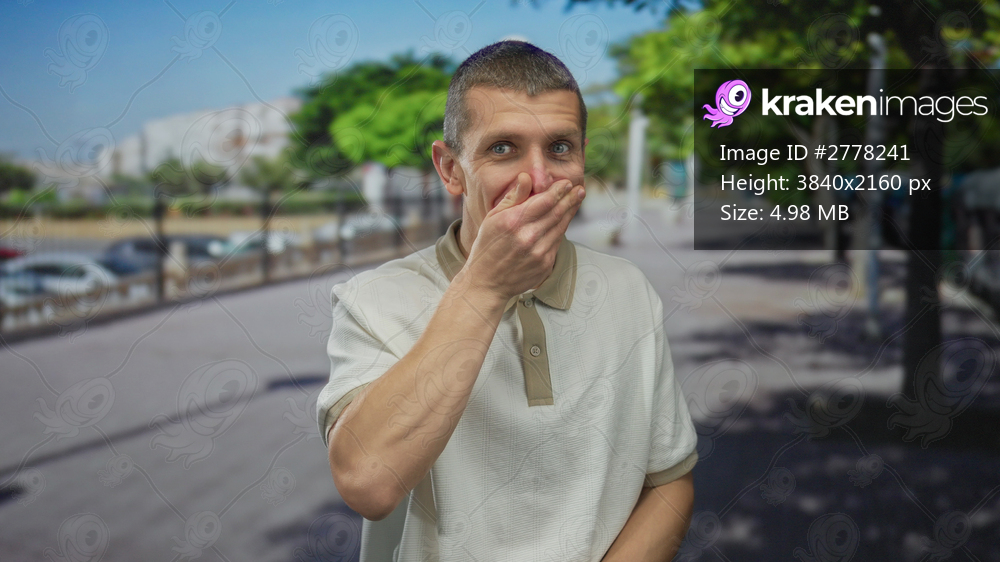 Man outdoors on a street covering his mouth with a thoughtful expression, wearing a casual white polo shirt under sunny trees