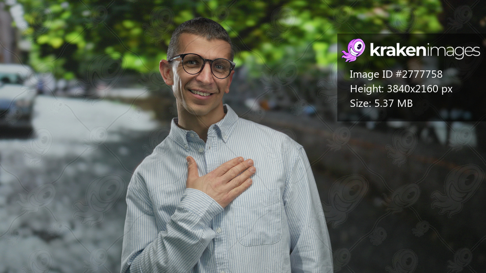 Man outdoors on a street with trees, wearing glasses and a striped shirt, smiling with hand on chest, creating a friendly urban atmosphere under green foliage. - Kraken Images