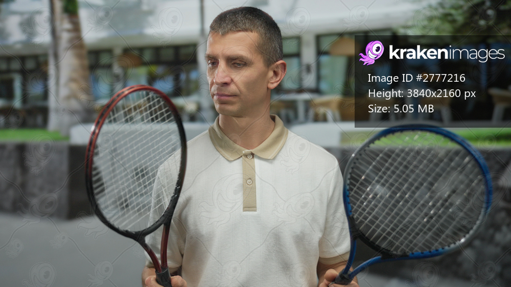 Man outdoors on street holding two tennis rackets, contemplating choice in casual setting with cafe background, showcasing sports equipment and leisure activity. - Kraken Images