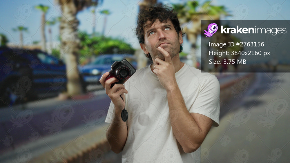 Man outdoors on street pondering with camera in hand, palm trees lining the background suggesting a warm, tropical location ideal for photography.