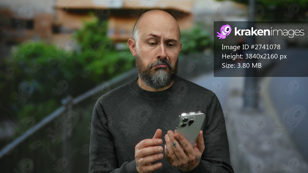 Man outdoors with smartphone on urban street showcasing thoughtful expression while dressed casually against blurred city backdrop captured in natural light setting. - Kraken Images