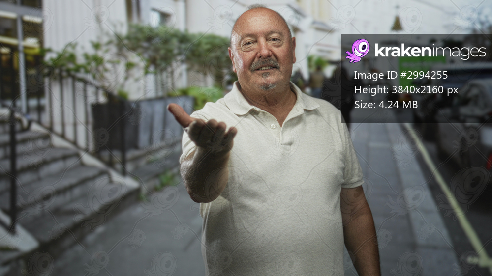 Man with outstretched hand offering palm to camera on a city street beside parked cars and steps; welcoming.
