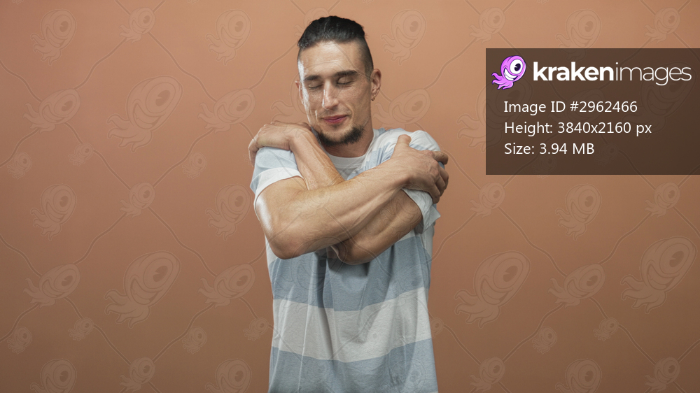 Man with outstretched hands reaching forward and smiling in studio with striped tshirt and peach backdrop; comfort embrace openness.