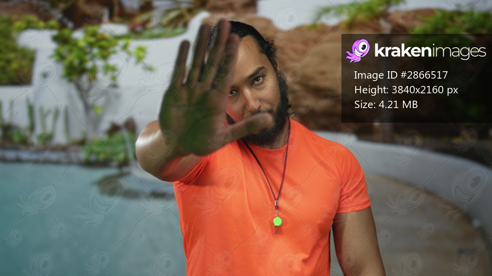 Man with outstretched palm blocking camera by a poolside at a resort building in orange shirt and pendant; serious boundary.