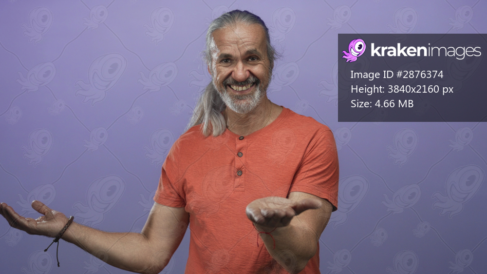 Man with outstretched palms and gentle smile, hoary long hair pulled back, wearing orange shirt in purple studio offering open hands; invitation warmth. - Kraken Images