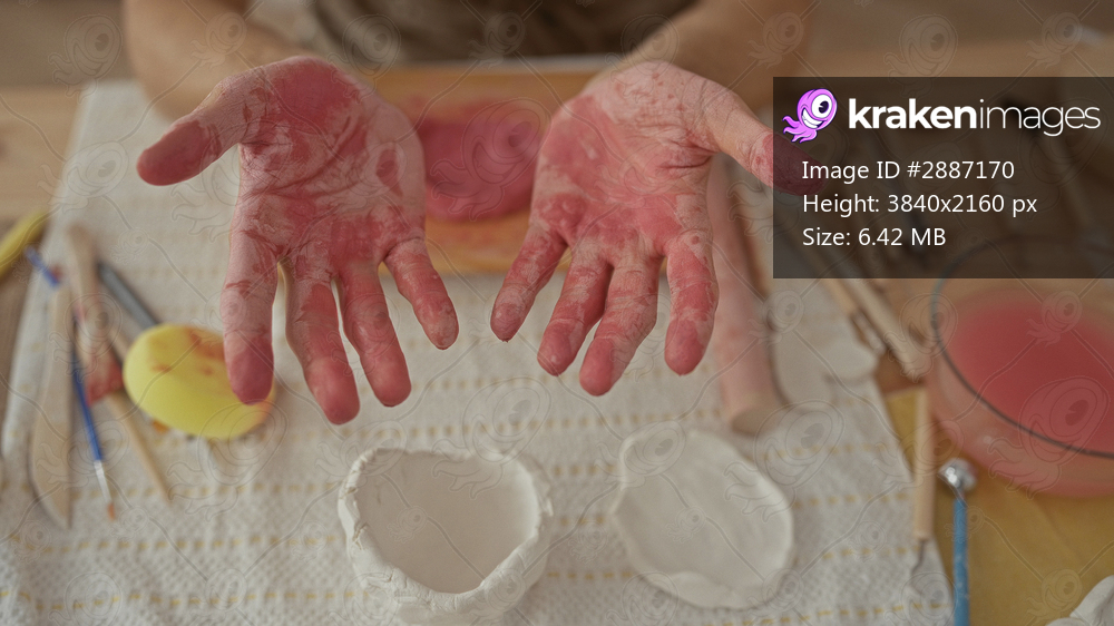 Man with paint covered hands palms up in studio workspace showing clay bowls and sculpting tools; creativity and craft.