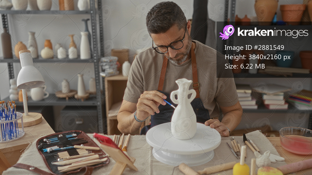 Man painting a ceramic vase on a pottery wheel in studio using a small brush and wearing an apron; creative focus.