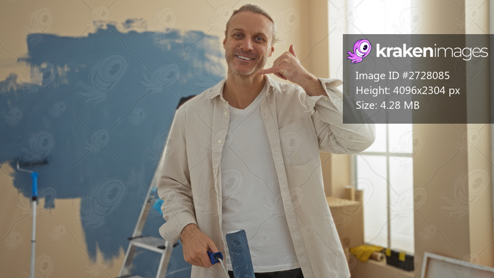 Man painting apartment smiling indoors holding paint roller near window showing call gesture relaxed expression.